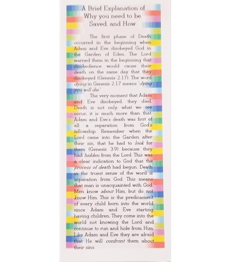This tract takes a person through the fact that there are three different kinds of death every man experiences if he is not saved. The first death is that we are born dead and do not know the Lord. The second is the physical death when our soul separates from our body. The third is an eternal death that we experience if we do not trust Christ for salvation.
